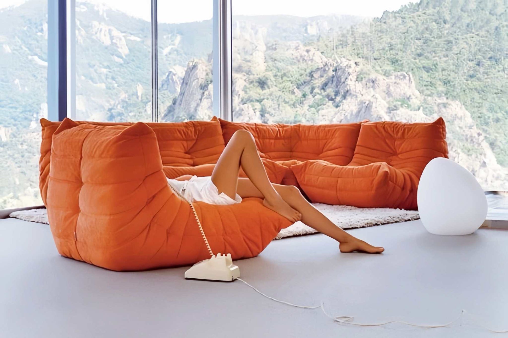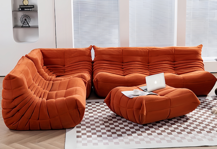 Découvrez notre superbe ensemble de canapés en velours côtelé ! Cet ensemble de canapés de style Togo est un incontournable pour tout espace de vie moderne. Le matériau en velours côtelé orange vif lui donne un aspect unique et accueillant. Notre ensemble de canapés comprend une chaise simple, un canapé 2 places, un canapé 3 places, un pouf et un canapé d'angle, offrant de nombreux sièges pour votre famille et vos invités.